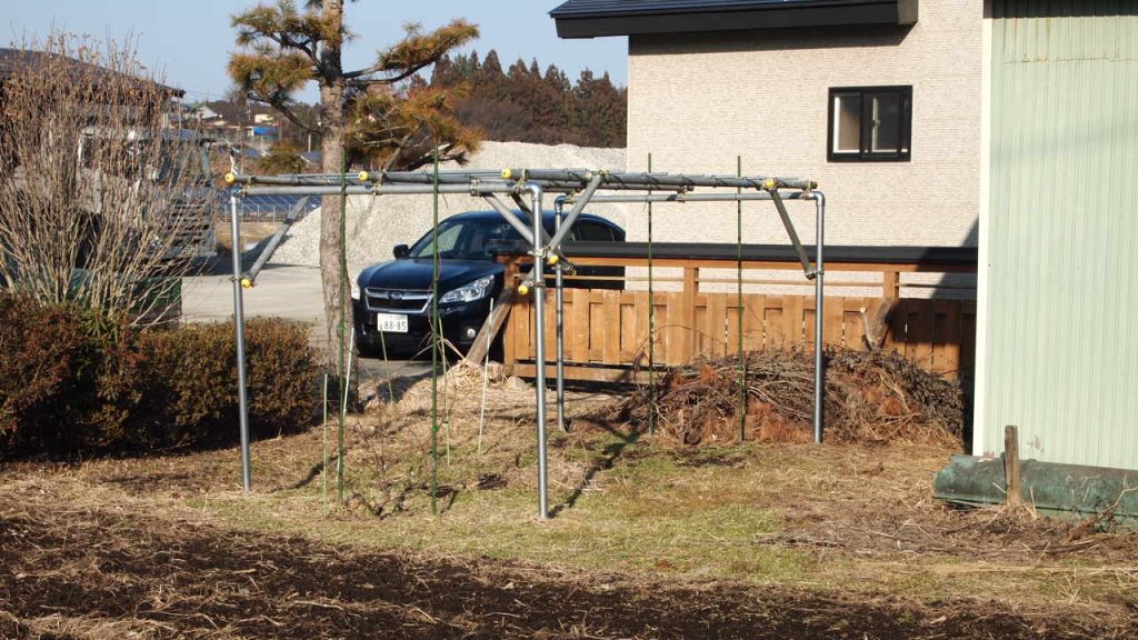 畑のキウイ棚の様子を見に行きました。今年の豪雪の影響がなかったか・・・。