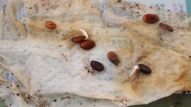 最初から種を土に直接植えないで、このように発根させてから土に植え付けます。